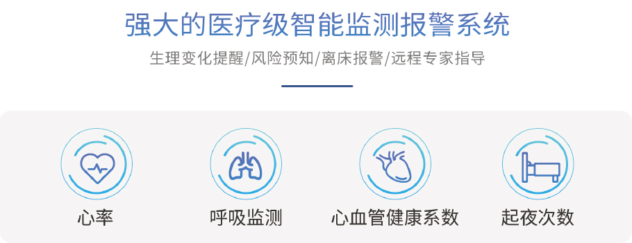 強大的醫療級智能監測報警系統:有效監測睡眠質量,實時采集心率、呼吸、體動及離床數據,分析并自動生成診斷報告,能有效實現生理變化提醒、風險預知、離床報警等功能,遠程專家指導。